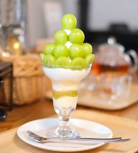 山梨県に展開する2店舗を除き、日本で味わえるのは和蔵場だけという限定メニューで、旬のシャインマスカット約15粒(果実の大きさにより前後します)を贅沢に使用し、高さ約23㎝のパフェに仕上げました。