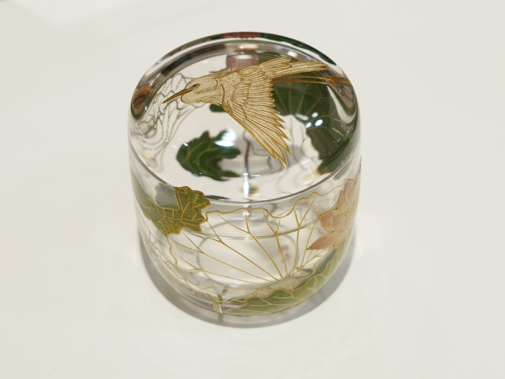 蓮池の上を飛ぶ白鷺と、朝に咲き昼に閉じる蓮の花が映す夏の早朝の景色が描かれています。山中漆器の木地挽き轆轤技術による透明な中棗が、涼やかなお点前を演出します。