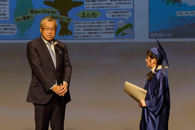- 東京都小学4年生の綾音さんが、羽田未来総合研究所賞を受賞。当社社長の大西が表彰状を授与しました。
